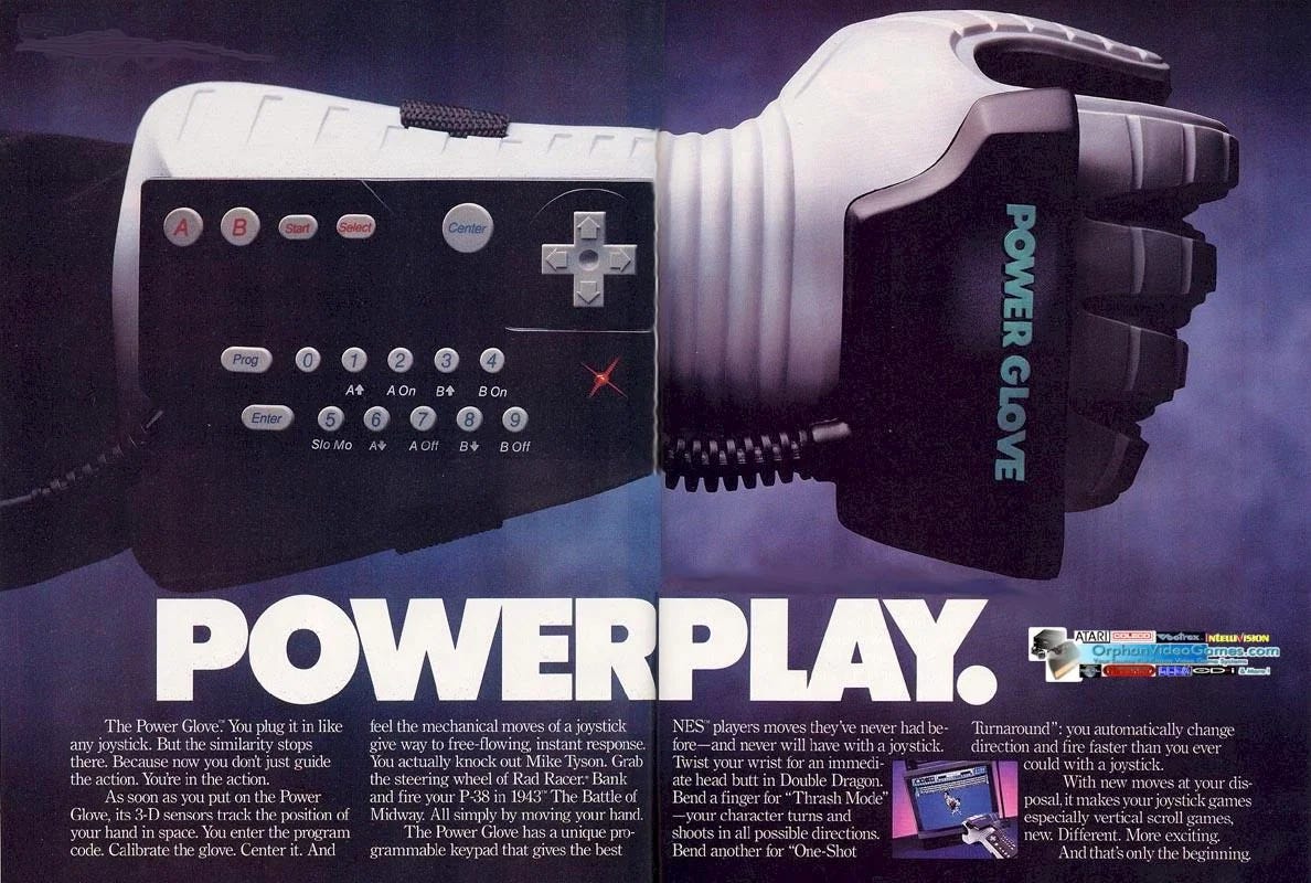 – George Zachary, “Generator,” November 1996—a column in Next Generation, a video game magazine. This particular column focused on the Data Glove and Power Glove; discovered through the Wikipedia citation for the claim that the PowerGlove sold over a million units. An interesting long-ago comp for the Vision Pro—reportedly over 200,000 units sold so far, although those are month-old numbers so I’d be curious for the update.